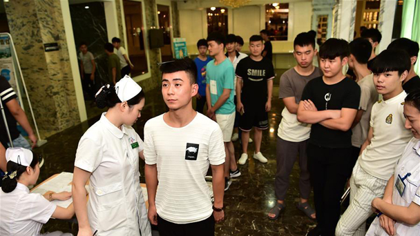 8月3日,來自合肥南七街道的應(yīng)征青年在中國(guó)人民解放軍第105醫(yī)院參加體檢。近日,安徽省2017年夏秋季征兵體檢工作陸續(xù)展開,應(yīng)征入伍的青年紛紛到指定體檢醫(yī)院參加征兵體檢。近日,安徽省2017年夏秋季征兵體檢工作陸續(xù)展開,應(yīng)征入伍的青年紛紛到指定體檢醫(yī)院參加征兵體檢。