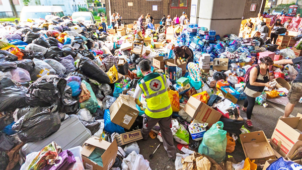 6月14日凌晨,倫敦西區27層高的格倫費爾大樓發生火災,造成至少17人喪生,70多人受傷。災難發生后,人們捐助的衣物、食品、生活用品等各類物資堆滿了大家自發組織的臨時住所。