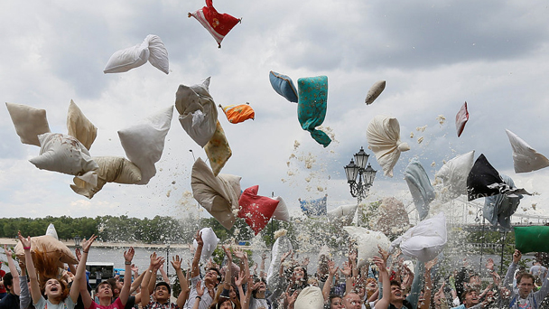 當地時間5月20日,在烏克蘭首都基輔,當地人在街頭舉行了“枕頭大戰”。