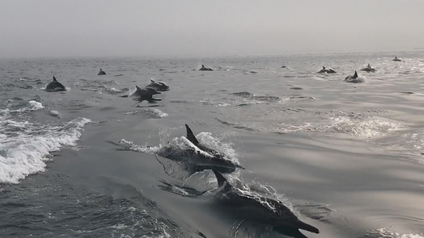 日前,幾名海釣“釣友”出海時,在廣東汕頭南澳島海域巧遇數(shù)百只海豚“集體競速”,他們用無人機記錄下這一場面。