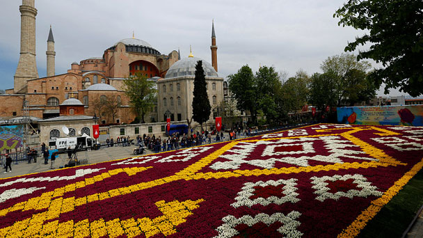 當?shù)貢r間4月22日,土耳其舉辦第12屆郁金香節(jié)。在土耳其伊斯坦布爾的蘇丹艾哈邁德廣場現(xiàn)巨型“花毯”,正義與發(fā)展黨議員艾哈邁德·哈姆迪·恰姆勒同伊斯坦布爾市市長卡迪爾·托普巴斯在“花毯”前自拍留念。