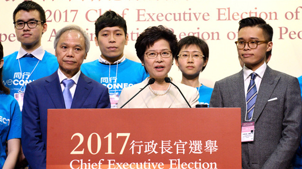 3月26日,林鄭月娥當(dāng)選香港特區(qū)第五任行政長官人選后會見媒體。