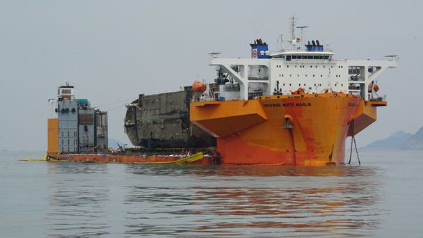 25日下午,銹跡斑斑的船體整體出水,打撈作業(yè)最關(guān)鍵也是最困難的“整體起浮”階段取得成功。這意味著“世越”號打撈工作基本宣告成功。韓國海洋水產(chǎn)部26日消息稱,為將“世越”號沉船運(yùn)至木浦新港,打撈組正加速進(jìn)行排水和除油工作。