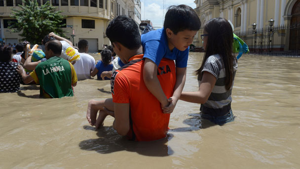秘魯多地連續(xù)多日持續(xù)遭到洪水襲擊。由于連續(xù)15個小時的暴雨,秘魯北部的皮烏拉出現(xiàn)河水決堤、街道被淹,當(dāng)?shù)孛癖姴坏貌淮┻^積水的街道。