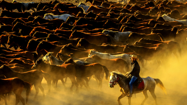 3月28日,在土耳其開塞利的山上,牧羊人趕著馬群,馬兒們向著同一個方向奔去,場面十分壯觀。