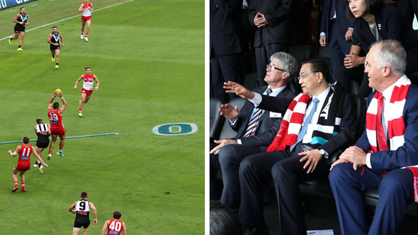 李克強(qiáng)總理與澳大利亞總理特恩布爾25日下午在悉尼現(xiàn)場觀看了澳式橄欖球聯(lián)盟勁旅悉尼天鵝隊與阿德萊德港隊的比賽。賽前,兩位總理在熱身區(qū)與隊員、教練們親切互動,分別向兩支球隊贈送了紀(jì)念品。李克強(qiáng)表示,希望澳大利亞球隊來中國比賽,增進(jìn)兩國的人文交流。