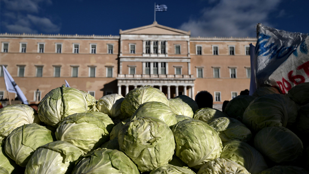 2月14日,希臘農(nóng)民為反對(duì)新稅收措施上街游行,要求減少稅收,增加補(bǔ)貼。