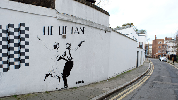 英國(guó)涂鴉藝術(shù)家芭比改編自電影《愛樂之城》創(chuàng)作的涂鴉《謊言之城》在倫敦街頭出現(xiàn),不過這里的主角換成了美國(guó)總統(tǒng)特朗普與英國(guó)首相特雷莎·梅。