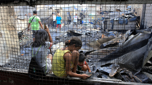 2月8日,菲律賓馬尼拉一非法棚戶區遭遇大火,火情長達10小時,逾1000房屋被燒毀,3000人流離失所。9日,當地民眾來到被火燒毀房屋廢墟中尋找個人財物,也有人在棚戶區邊休息。