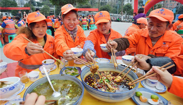 1月18日,重慶市綦江區(qū)一餐飲店免費為526名環(huán)衛(wèi)工人設宴,提前請他們吃愛心“團年飯”,并送去節(jié)日的祝福。