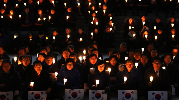 當?shù)貢r間2016年12月8日,在韓國總統(tǒng)樸槿惠彈劾案表決前夕,韓國在野黨共同民主黨議員在國會外點燭集會,高喊彈劾口號。