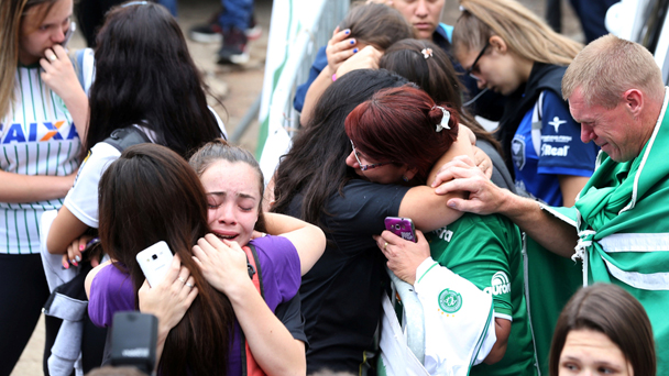 當地時間2016年11月29日,巴西足球俱樂部沙佩科恩斯隊遭遇空難。30日,大批球迷集結俱樂部球場悼念,不少人甚至相擁痛哭。