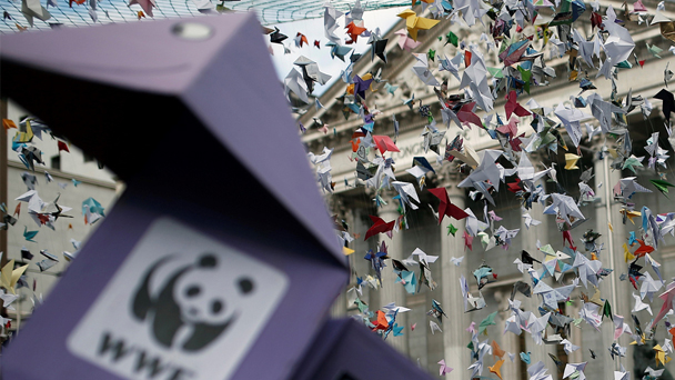 11月24日,世界自然基金會(WWF)在西班牙馬德里議會外放置數(shù)千只紙鶴,呼吁當(dāng)?shù)卣Wo科托多尼亞納國家公園。