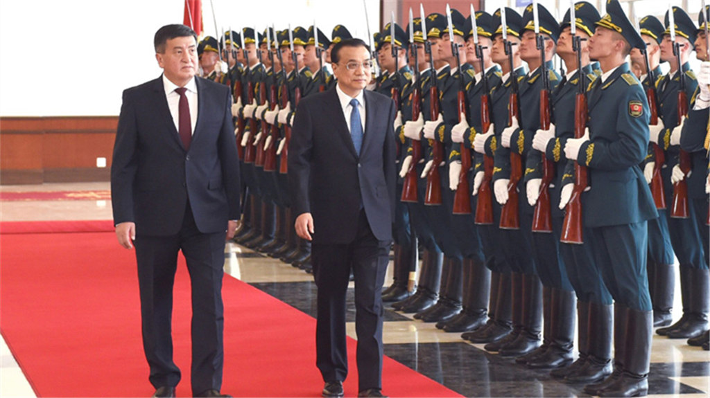 李克強總理2日下午抵達吉爾吉斯斯坦首都比什凱克,吉總理熱恩別科夫在機場貴賓大廳為李克強總理舉行隆重的歡迎儀式。軍樂隊先后奏響中吉兩國國歌,李克強在熱恩別科夫陪同下,沿紅地毯檢閱儀仗隊。
