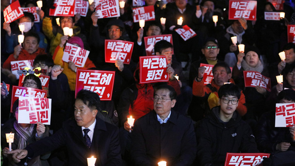2016年11月2日,韓國首爾市長樸元淳領導民眾舉行燭光集會,呼吁總統(tǒng)樸槿惠辭職下臺。