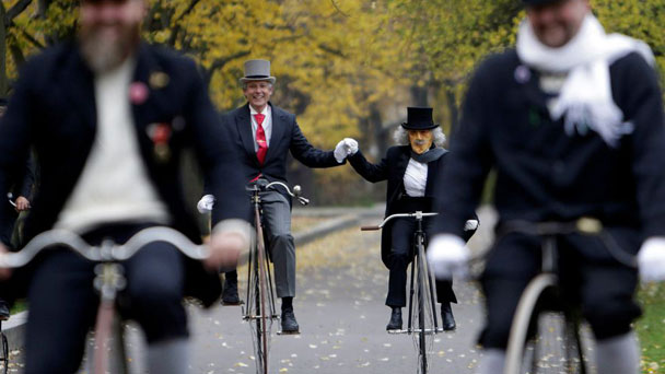 當?shù)貢r間2016年11月5日,捷克布拉格,自行車愛好者參加傳統(tǒng)的“布拉格英里”高輪自行車比賽。捷克高輪自行車俱樂部成立于1880年,其成員每年都參加這樣的活動。