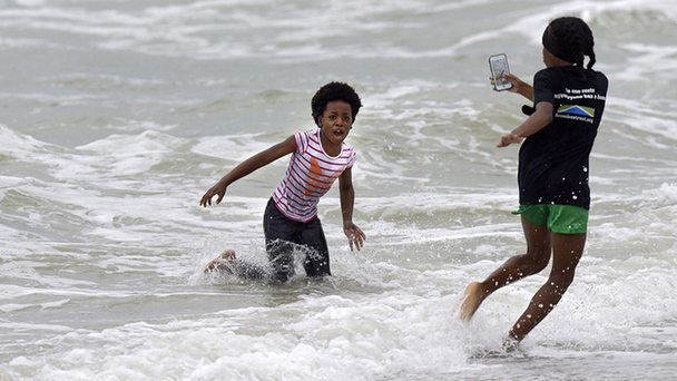 颶風“馬修”近日直擊美國東南部,不過民眾似乎無所畏懼,仍在海濱戲水玩耍。