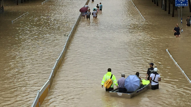 9月28日,今年第17號臺風(fēng)“鲇魚”以臺風(fēng)級登陸福建省泉州市惠安縣沿海,福州遭強(qiáng)降雨侵襲,街道被洪水淹沒。