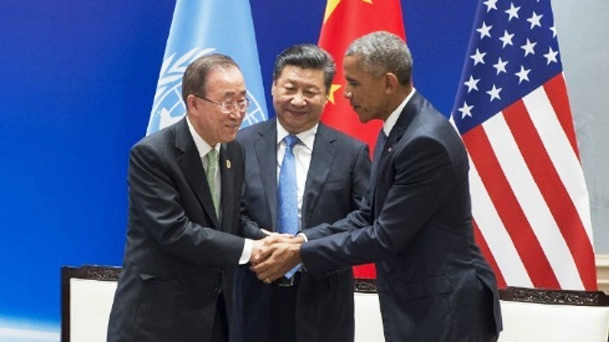 國家主席習近平3日同美國總統奧巴馬、聯合國秘書長潘基文在杭州共同出席氣候變化《巴黎協定》批準文書交存儀式。
