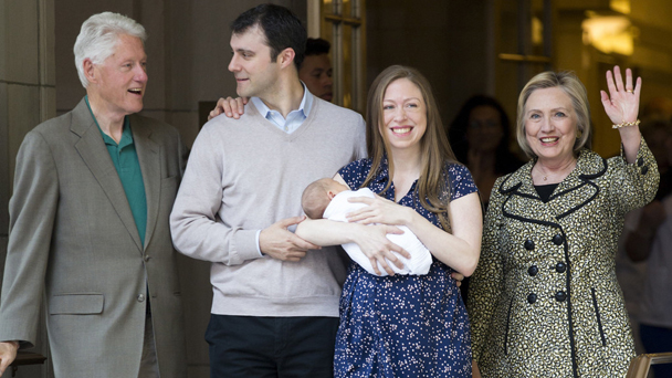 紐約當?shù)貢r間2016年6月20日,美國前總統(tǒng)克林頓的女兒切爾西抱著寶寶出院,丈夫馬克·梅茲文斯基、母親希拉里及父親克林頓陪同。