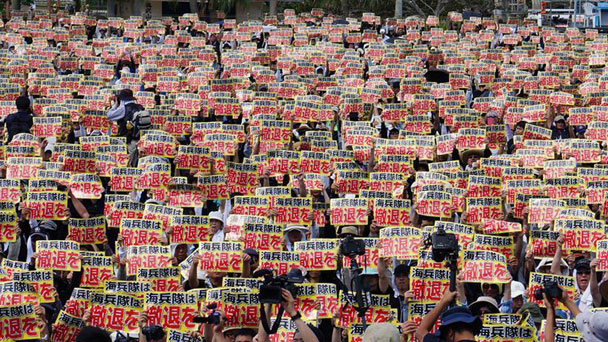 6月19日,在日本沖繩縣首府那霸市一座公園內,市民手舉“撤走(美國)海軍陸戰隊”的標語。新華社記者沈紅輝攝 6月19日,在日本沖繩縣首府那霸市一座公園內,一名抗議者手舉“我是美軍暴行受害者”的標語。