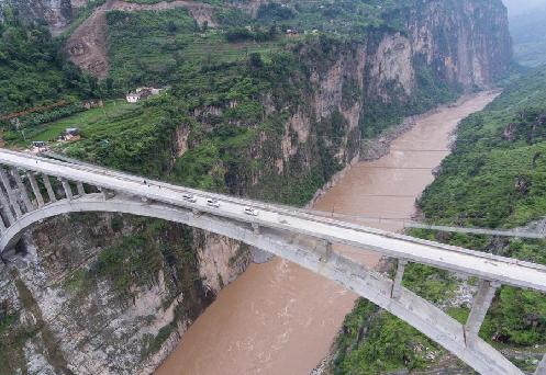 7月10日,布拖縣馮家坪金沙江“溜索改橋”項目基本建成,連接四川省布拖縣馮家坪村和云南省巧家縣鸚哥村的一座跨江大橋歷經2年半終于達到了通車條件。新華社記者 江宏景攝 俯瞰布拖縣馮家坪金沙江“溜索改橋”項目跨江大橋(7月8日無人機拍攝)。