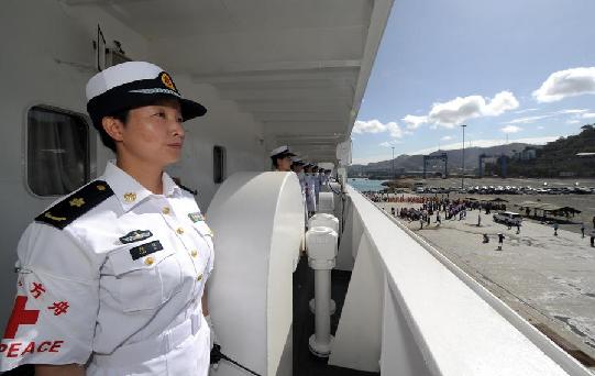 7月11日,在巴布亞新幾內亞首都莫爾茲比港,中國海軍和平方舟醫院船的醫護人員在甲板列隊站坡。新華社發(江山攝) 7月11日,在巴布亞新幾內亞首都莫爾茲比港,當地民眾跳起傳統舞蹈,歡迎中國海軍和平方舟醫院船。