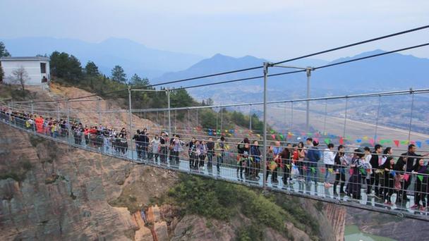 湖南石牛寨迎春節(jié)旅游高峰 百人同過玻璃橋