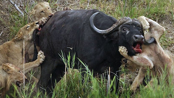 28歲的保護區管理員羅安(Roan Ravenhill)近日就拍到一組驚心動魄的照片:一只幼獅撲上一頭水牛撕咬時,腹部不幸被尖銳的牛角刺穿,并被牢牢釘住,性命攸關。這時,另外4只同伴撲上來圍攻水牛。