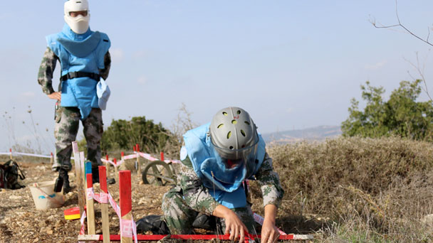今年是聯(lián)合國(guó)開展維和行動(dòng)70周年,也是中國(guó)參與聯(lián)合國(guó)維和行動(dòng)28周年。2017年11月8日,在位于黎巴嫩南部靠近以色列邊境的“藍(lán)線”附近,中國(guó)維和官兵掃雷作業(yè)手在組長(zhǎng)的監(jiān)督下作業(yè)。