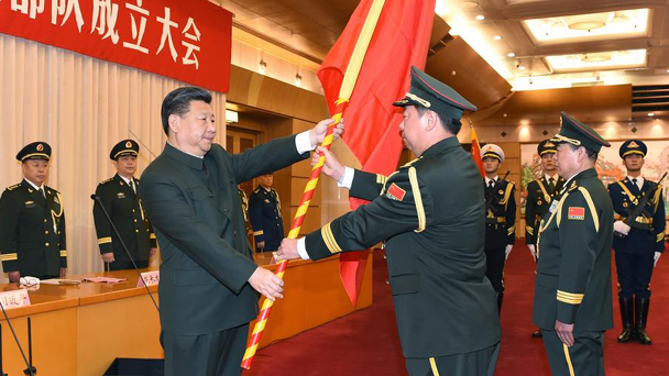 原標(biāo)題:習(xí)近平向中國(guó)人民解放軍陸軍火箭軍戰(zhàn)略支援部隊(duì)授予軍旗并致訓(xùn)詞 2015年12月31日,中國(guó)人民解放軍陸軍領(lǐng)導(dǎo)機(jī)構(gòu)、中國(guó)人民解放軍火箭軍、中國(guó)人民解放軍戰(zhàn)略支援部隊(duì)成立大會(huì)在北京八一大樓隆重舉行。