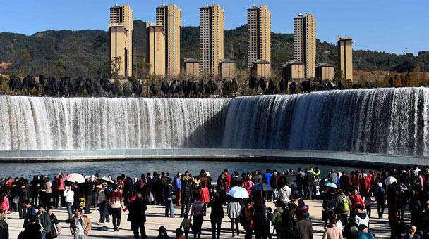 1月2日,游人在新建成的昆明瀑布公園參觀游覽。公園的瀑布景觀區(qū)充分利用牛欄江引水入滇工程而形成人工瀑布及湖泊,其利用約12.5米的地勢(shì)高差,建設(shè)成寬幅約400米的人工瀑布。新華社記者藺以光 攝 近日,位于云南省昆明市北部山水新區(qū)的昆明瀑布公園建設(shè)完工并免費(fèi)向市民開放。