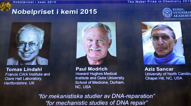 據(jù)諾貝爾獎官網(wǎng)的最新消息,瑞典斯德哥爾摩當(dāng)?shù)貢r間7日中午11時45分,2015年諾貝爾化學(xué)獎在當(dāng)?shù)氐娜鸬浠始铱茖W(xué)學(xué)院揭曉,托馬斯?林道爾、保羅?莫德里奇以及阿奇茲?桑卡獲獎。獲獎理由是“DNA修復(fù)的細胞機制研究”。