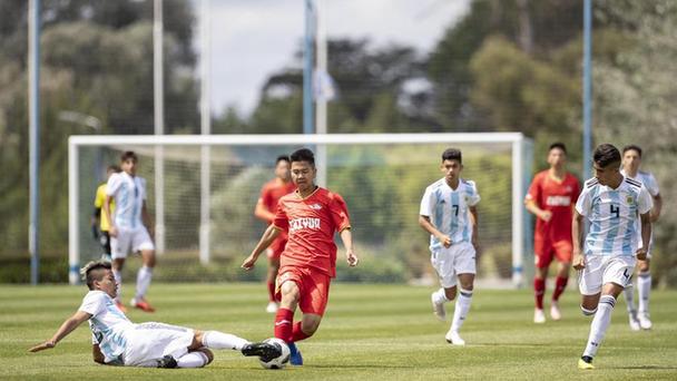 11月28日,在阿根廷布宜諾斯艾利斯的阿根廷國(guó)家足球訓(xùn)練基地,球員張文豪(左二)在訓(xùn)練賽中。來(lái)自北京體育大學(xué)中國(guó)足球運(yùn)動(dòng)學(xué)院的青少年足球運(yùn)動(dòng)員與教練員正式進(jìn)駐阿根廷國(guó)家足球訓(xùn)練基地,在這里接受30天的高水平訓(xùn)練。