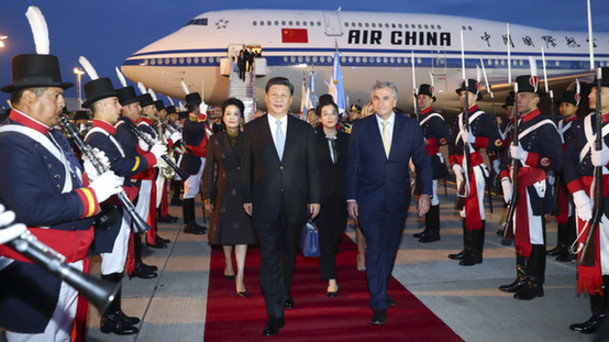 儀仗隊(duì)長(zhǎng)趨前致敬,軍樂(lè)團(tuán)奏響雄勁有力的進(jìn)行曲,習(xí)近平和彭麗媛沿紅地毯前行,禮兵分列紅地毯兩側(cè),行注目禮。習(xí)近平指出,阿根廷是首個(gè)舉辦二十國(guó)集團(tuán)領(lǐng)導(dǎo)人峰會(huì)的南美國(guó)家,今年又恰逢峰會(huì)啟動(dòng)10周年,具有重要意義。