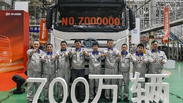 當(dāng)日,一輛白色解放J7緩緩駛下一汽解放卡車(chē)廠總裝車(chē)間生產(chǎn)線,這標(biāo)志著我國(guó)自主研發(fā)的第700萬(wàn)輛解放卡車(chē)在長(zhǎng)春正式下線。 新華社記者 許暢 攝 11月30日,媒體記者在拍攝展出的第一代解放CA10型卡車(chē)(左)和解放J7卡車(chē)(右)。