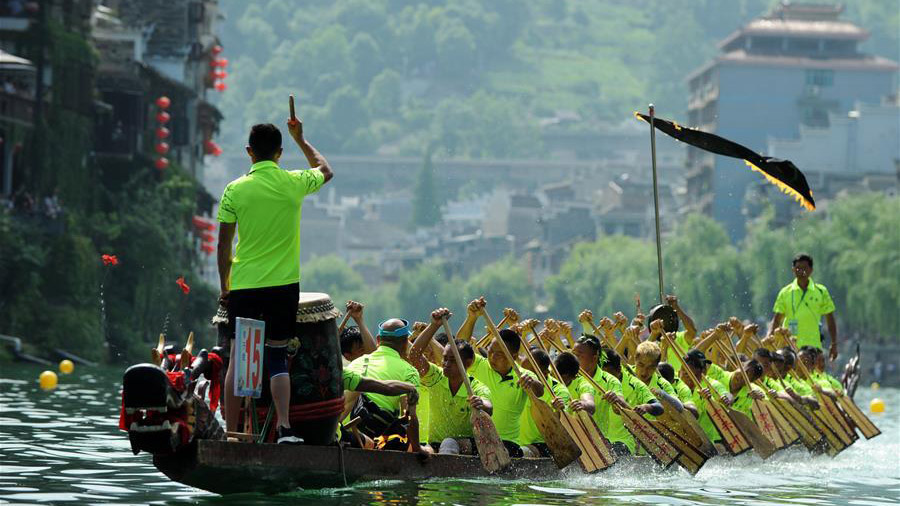 6月18日,在貴州省黔東南苗族侗族自治州鎮(zhèn)遠(yuǎn)縣 陽(yáng)河上,當(dāng)?shù)厝罕娫趥鹘y(tǒng)龍舟賽上賽龍舟。新華社發(fā)(楊文斌 攝) 6月18日,在貴州省黔東南苗族侗族自治州鎮(zhèn)遠(yuǎn)縣 陽(yáng)河上,當(dāng)?shù)厝罕娫趥鹘y(tǒng)龍舟賽上賽龍舟。