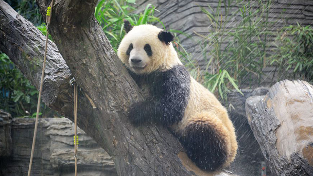 當日,北京出現(xiàn)高溫天氣,北京動物園采取分時段淋浴和噴霧等方式,給大熊貓防暑降溫。