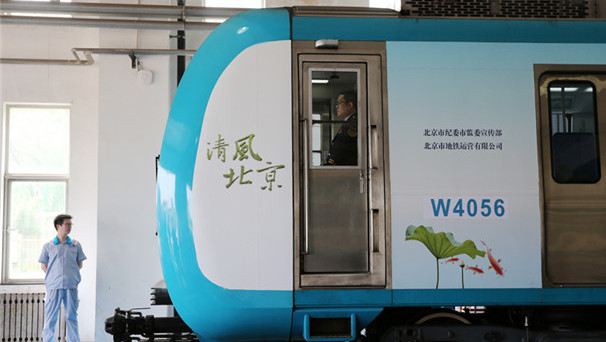 5月9日下午3時,首列“清風北京”廉潔文化主題地鐵列車在北京地鐵六里橋站正式駛出,車廂內外隨處可見憲法、監察法的宣傳標識。