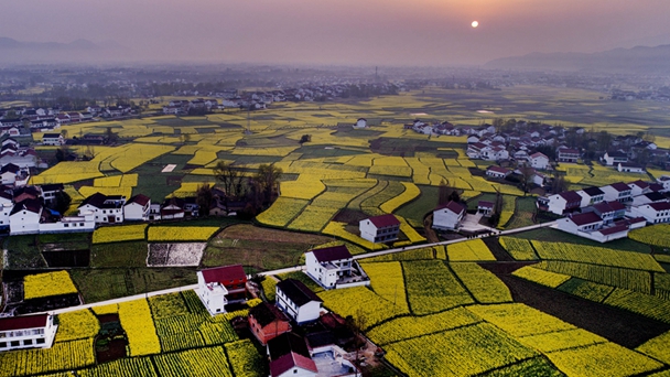 3月21日,一列動車正通過漢中市南鄭縣新集鎮油菜花海(無人機拍攝)。