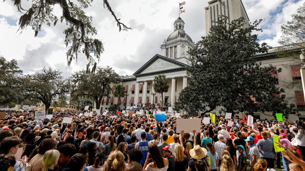 當地時間2018年2月20日,美國佛羅里達州瑪喬麗·斯通曼·道格拉斯高中的學生和幸存者乘車前往州議會大廈,學生希望與議員們討論槍支管制改革。
