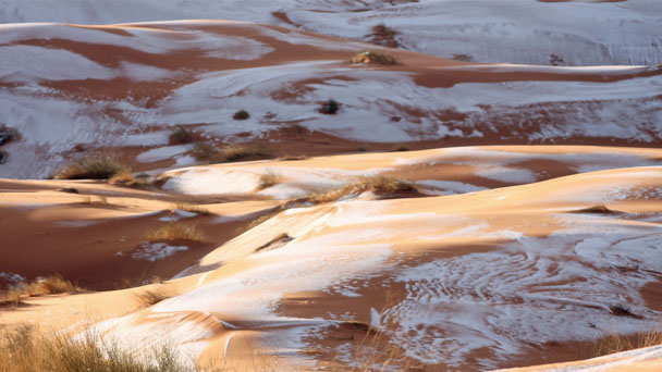 7日,撒哈拉北部“門戶”、阿爾及利小鎮(zhèn)艾因塞弗拉凌晨降下近40年來第三場(chǎng)雪,漫漫黃沙仿佛披上了白色的外衣,白雪與黃沙交相輝映十分壯美。