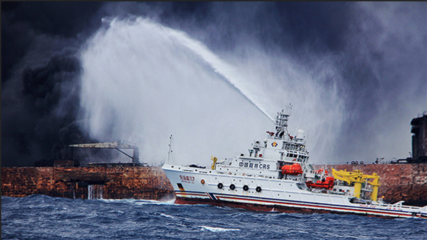 1月12日,上海海事局的救援船只在向“桑吉”輪噴射泡沫降溫滅火。中國救援人員正冒著巨大的生命危險(xiǎn)和安全威脅不斷接近事故船只,全力做好人員搜救、消防滅火、污染防控工作。新華社發(fā) 1月12日,上海海事局的救援船只在向“桑吉”輪噴射泡沫降溫滅火。