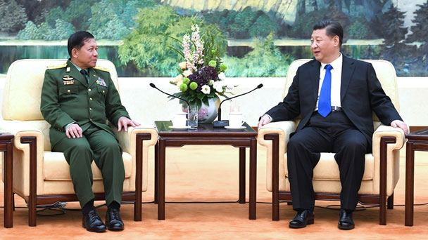 11月24日,中共中央總書記、國家主席、中央軍委主席習近平在北京人民大會堂會見來華訪問的緬甸國防軍總司令敏昂萊。新華社記者饒愛民 攝