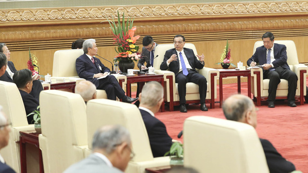 國務(wù)院總理李克強11月21日下午在人民大會堂會見日本經(jīng)濟團體聯(lián)合會會長榊原定征、日中經(jīng)濟協(xié)會會長宗岡正二、日本商工會議所會長三村明夫率領(lǐng)的日本經(jīng)濟界代表訪華團并同他們座談。