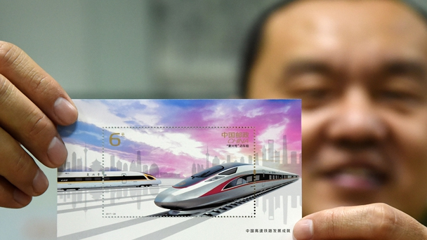 11月25日,中國郵政集團公司河北省新樂市分公司工作人員展示《中國高速鐵路發(fā)展成就》紀(jì)念郵票。新華社發(fā) 賈敏杰 攝 11月25日,中國郵政集團公司河北省邯鄲市分公司工作人員展示《中國高速鐵路發(fā)展成就》紀(jì)念郵票小型張。