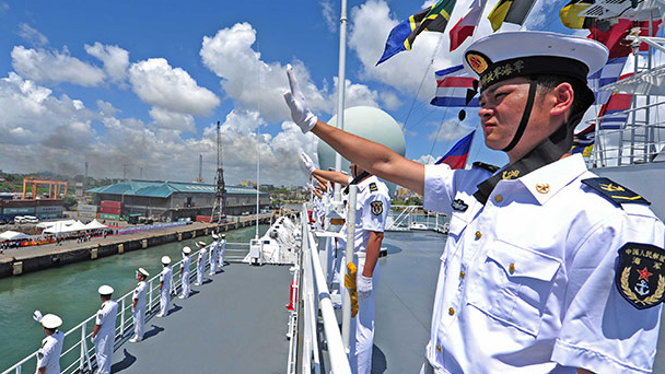 11月26日,在坦桑尼亞達(dá)累斯薩拉姆港,中國海軍和平方舟醫(yī)院船官兵向前來送行的人們揮手告別。