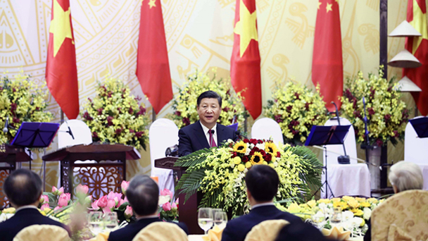 中共中央總書記、國家主席習近平12日出席越共中央總書記阮富仲和越南國家主席陳大光在河內國際會議中心舉行的隆重歡迎宴會。
