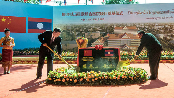 11月14日,中共中央總書記、國家主席習近平同老撾人民革命黨中央委員會總書記、國家主席本揚在萬象一道出席瑪霍索綜合醫院奠基儀式。