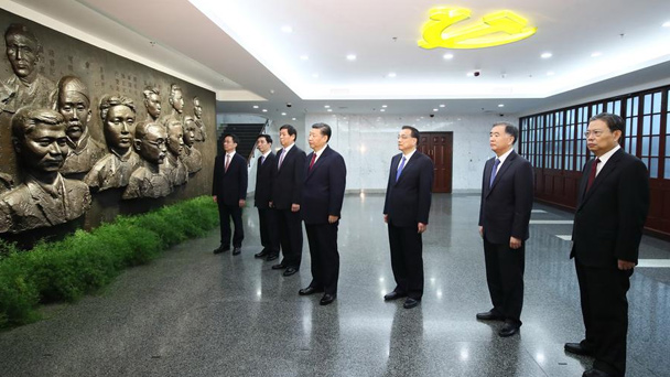10月31日上午,黨的十九大閉幕僅一周,習(xí)近平和李克強(qiáng)、栗戰(zhàn)書、汪洋、王滬寧、趙樂際、韓正,從北京乘專機(jī)來到上海,到興業(yè)路76號(hào)集體瞻仰中共一大會(huì)址。